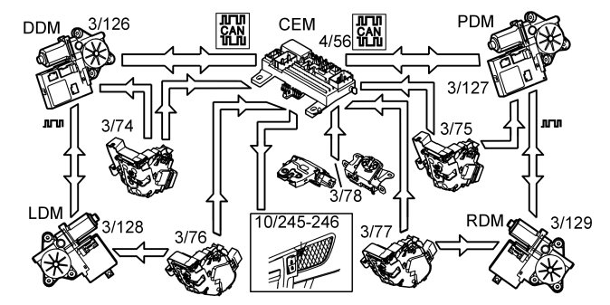 The vehicle is locked using the lock buttons on the door handles. During locking, the antenna is also activated to check that there is an authorized key in the vicinity of the vehicle. If the key is approved, the keyless vehicle module (KVM) transmits a signal to the central electronic module (CEM) to lock the vehicle.