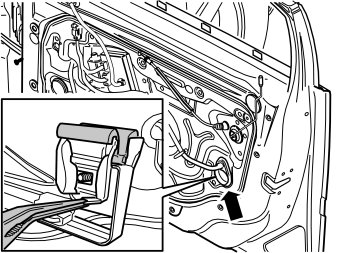 Remove the rubber lip located in the glass clamp. Use a pair of bent pliers and pull it out through the rear hole of the door module.