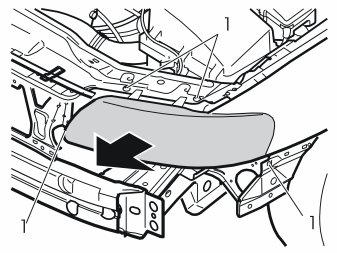 - Drill out the four blind rivets (1) which hold the inner wing liner at the bumper