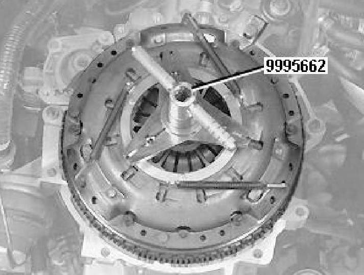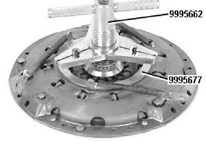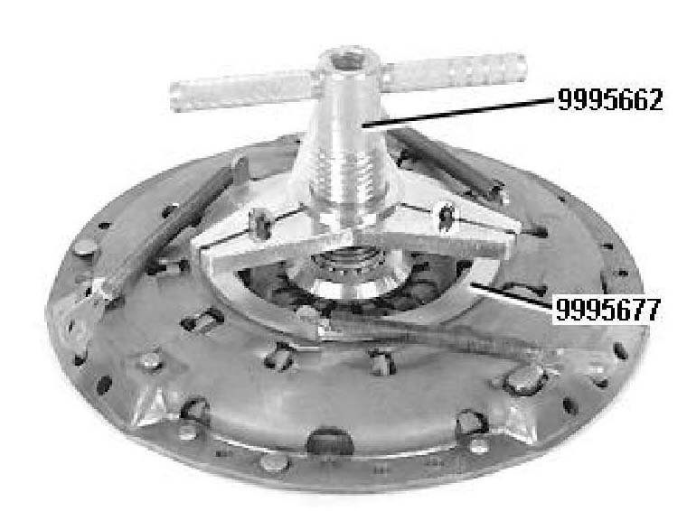 Install compression tool 999 5662, together with the conversion kit on the clutch. The tool is modified as described in the Tool Bulletin.