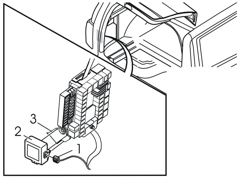 - Disconnect the pre-routed green (GN) connector (1), taped on the cable harness under the fuse holder. Connect the connector to the tilt sensor (2)