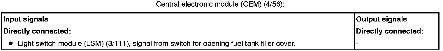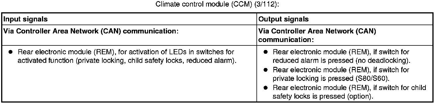 The tables below summarize the input and output signals to the units in the central locking function. The signal types are divided into directly connected signals and Controller Area Network (CAN) communication.