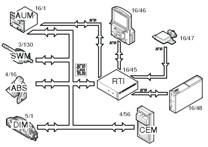 In order for the RTI system to select a route, a DVD (16/45) or CD (16/48) must be available with the road network. For CD changer systems the data is transmitted on a serial bus (Melbus) to the RTI.