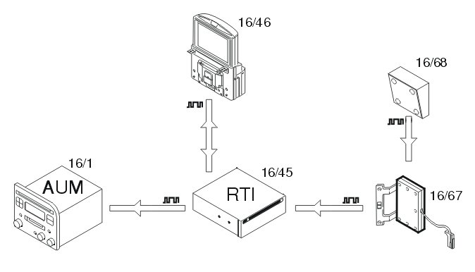 Commands from the remote control are sent from the display screen (16/46) to the RTI unit (16/45) on a serial bus (remocon signal).