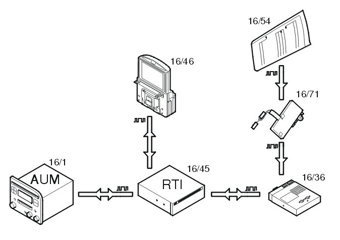 The TV antenna pattern on the rear windshield (16/54 for the V70/V70XC, 16/9 and S60/S80) receives signals from the TV network. These signals are boosted in the TV antenna amplifier (16/71) which sends the signals to the TV receiver (16/36). The signals are sent on to the RTI unit (16/45) on a serial bus (Melbus). The RTI unit send the signals containing sound information to the audio module (16/1) on a series bus (Melbus) and signals containing picture information to the display screen (16/46).