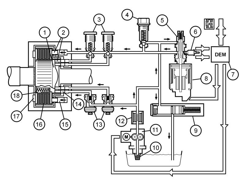 As before, the electronic feed pump starts as soon as the engine has started. Running the pump at a higher speed than before generates increased oil flow. The increased oil flow combined with the new relief and by-pass valve results in a pressure increase that can work on the clutch discs. Greater engine torque can thereby be transferred to the rear axle. The pretensioning function is controlled by software so that it is only activated when necessary.