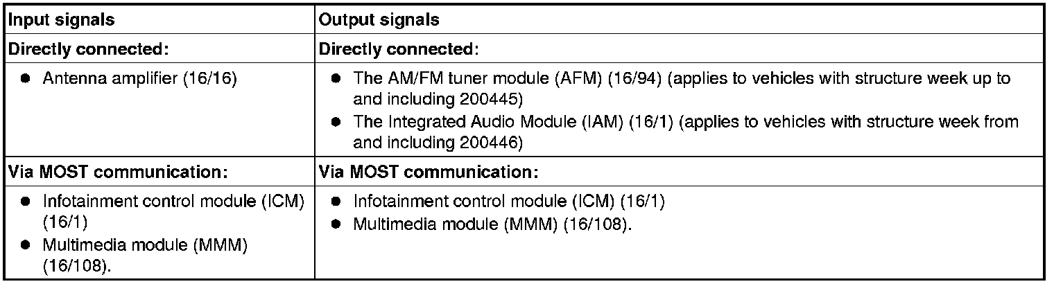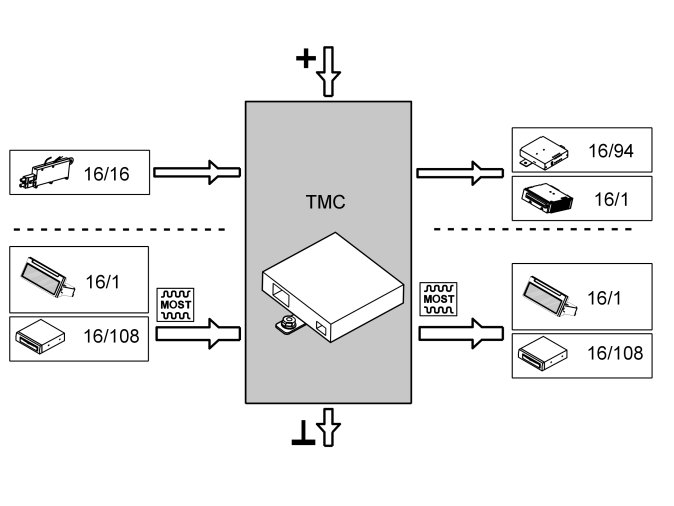 The table below summarizes the input signals to and output signals from the traffic message channel module (TMC). The signal types are divided into directly connected signals and MOST communication. The illustration below displays the same information with the Volvo component designations.