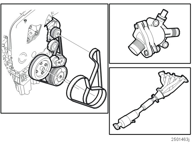 The tensioner consists or a spring and a friction element. The friction element provides the required damping to absorb small oscillations and speed variations. The spring ensures correct belt tension, irrespective of wear and temperature. The belts are made of cord reinforced rubber.