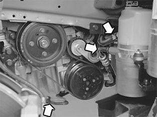 Relieve the load from the tensioner using a Torx-wrench. Turn the tensioner counter clockwise as far as it will go. Position the belt and release the tensioner.