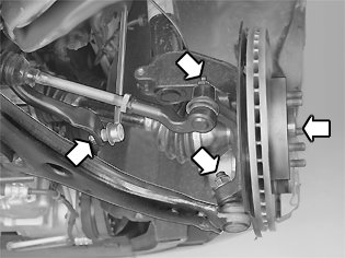 Pry down the control arm. Use: 999 7076 Lever 999 7076 Lever and install the ball joint. At the same time, guide the drive shaft into the wheel hub. Install the new nuts on both sides. Tighten. See Specifications. [1][2]Specifications.