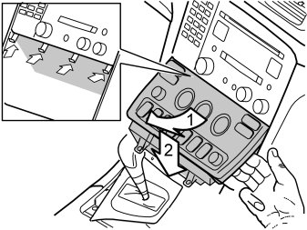 - Remove the left side panel (1) of the centre console by turning the clip and pulling the panel outward/rearward.