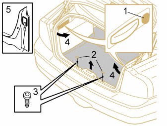 - Remove the clips (1) and plastic nut from the left front side panel in the cargo compartment. The front upper clip is most easily removed from the rear seat side.