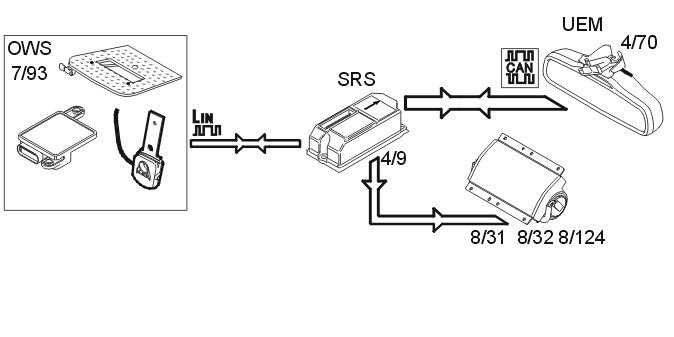 Under normal conditions the information from the occupant weight sensor (OWS) system (7/93) is the basis for whether the supplemental restraint system module (SRS) (4/9) should activate or deactivate the front passenger airbag (8/31 8/32 and 8/124). The occupant weight sensor (OWS) communicates continuously with the supplemental restraint system (SRS) module on the local LIN bus. When a passenger weighing more than a certain weight is in the seat, the supplemental restraint system module (SRS) is informed by the occupant weight sensor (OWS). The control module software activates the front passenger airbag, which means that the airbag has full functionality in the event of a collision. At the same time the supplemental restraint system module (SRS) transmits a signal on the controller area network (CAN) to the upper electronic module (UEM) (4/70), with a request to switch off the passenger airbag disconnected warning lamp. The upper electronic module (UEM) then switches off the passenger airbag disconnected warning lamp.