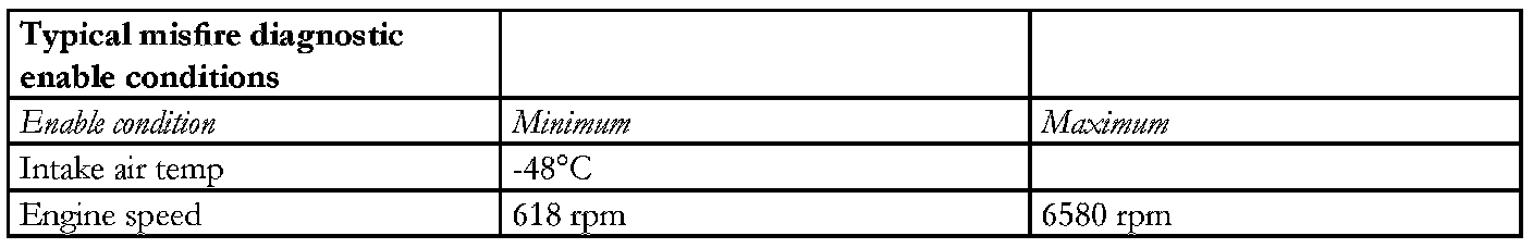 Misfire detection is enabled when the engine speed has reached 150 rpm below warm idle speed plus two crankshaft revolutions or after nine ignitions, depending on which occurs first. For detection of emission related misfires, the number of misfires which have occurred within the first interval of 1000 engine revolutions or the 4th exceedance (for the rest of DCY) over the emission threshold value after the first 1000 engine revolutions are relevant. If the number is so high that the exhaust emission standard is exceeded by a factor of 1.5, then the emission related misfire rate has been reached and exceeded a fault code will be stored. If misfires occur and the threshold is exceeded in the following DCY, MIL illuminates.
