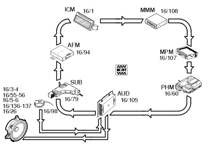 The audio module (AUD) can generate simple sound signals which are used for example to warn the driver and passengers if there are problems. These signals are transmitted from the infotainment control module (ICM) via the MOST network to the audio module (AUD).