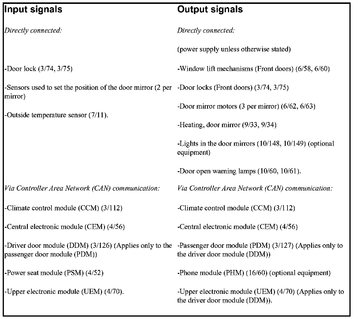 The driver door module (DDM) and passenger door module (PDM) communicate with directly connected components and with other control modules and components connected via Controller area network (CAN) communication.