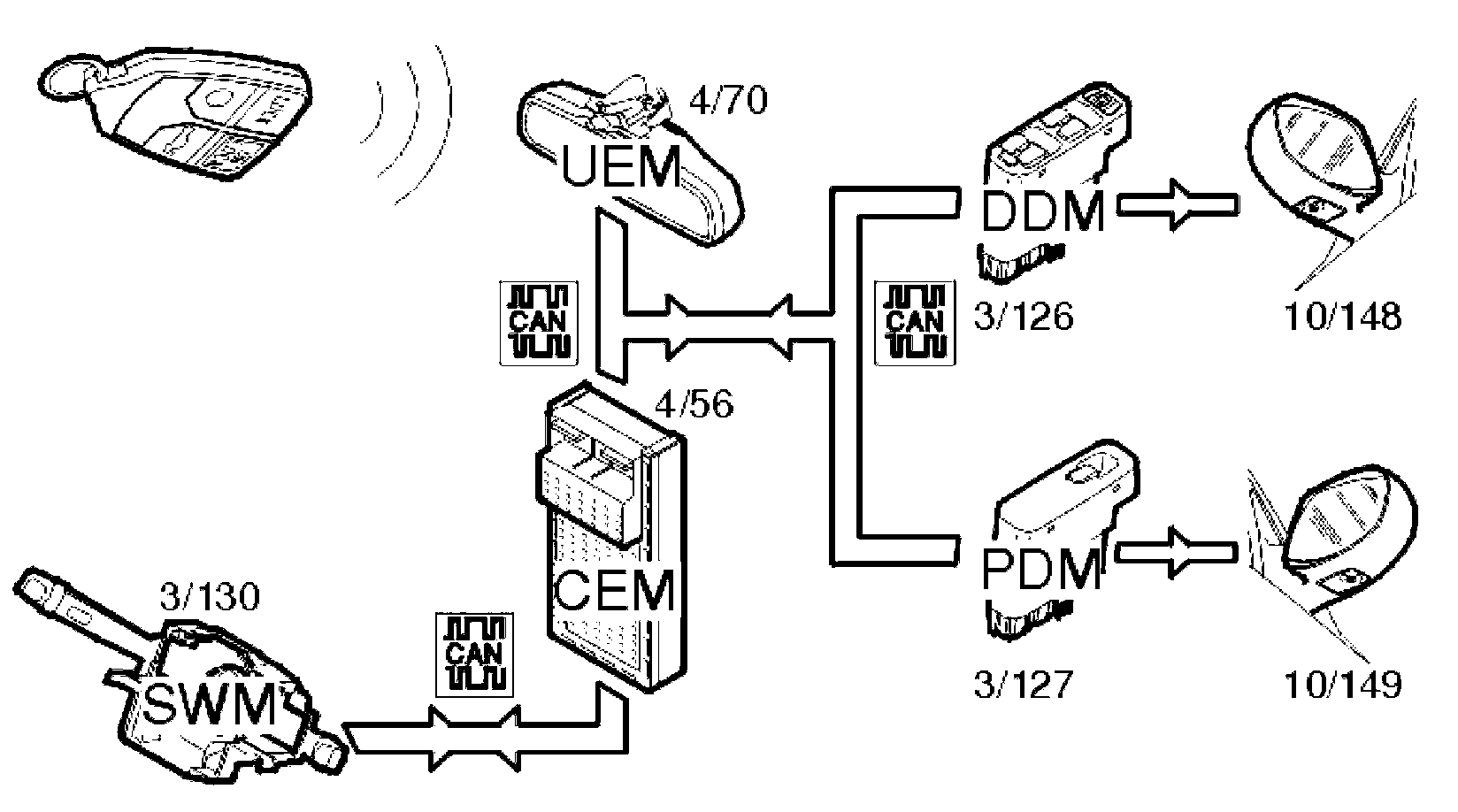 Window control is activated via switches on the driver door module (DDM) (3/126) and passenger door module (PDM) (3/127). The motor for the power window on the driver's side (6/58) is controlled directly from the driver door module (DDM). The motor for the power window on the passenger side (6/60) is controlled via CAN communication from the driver door module (DDM) to the passenger door module (PDM). The signals for operating the rear windows are transmitted from the driver door module (DDM) via the controller area network (CAN) to the central electronic module (CEM) (4/56), which manages the rear window functions.