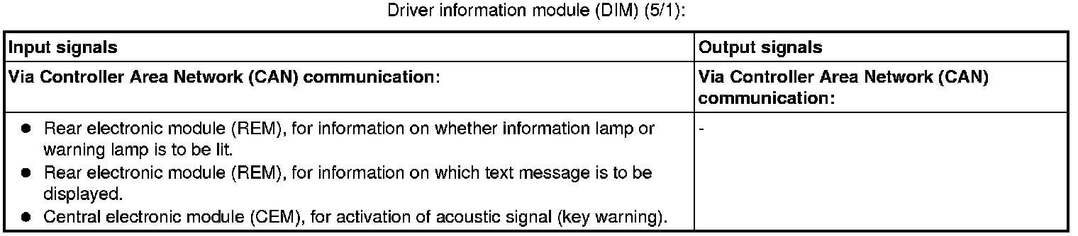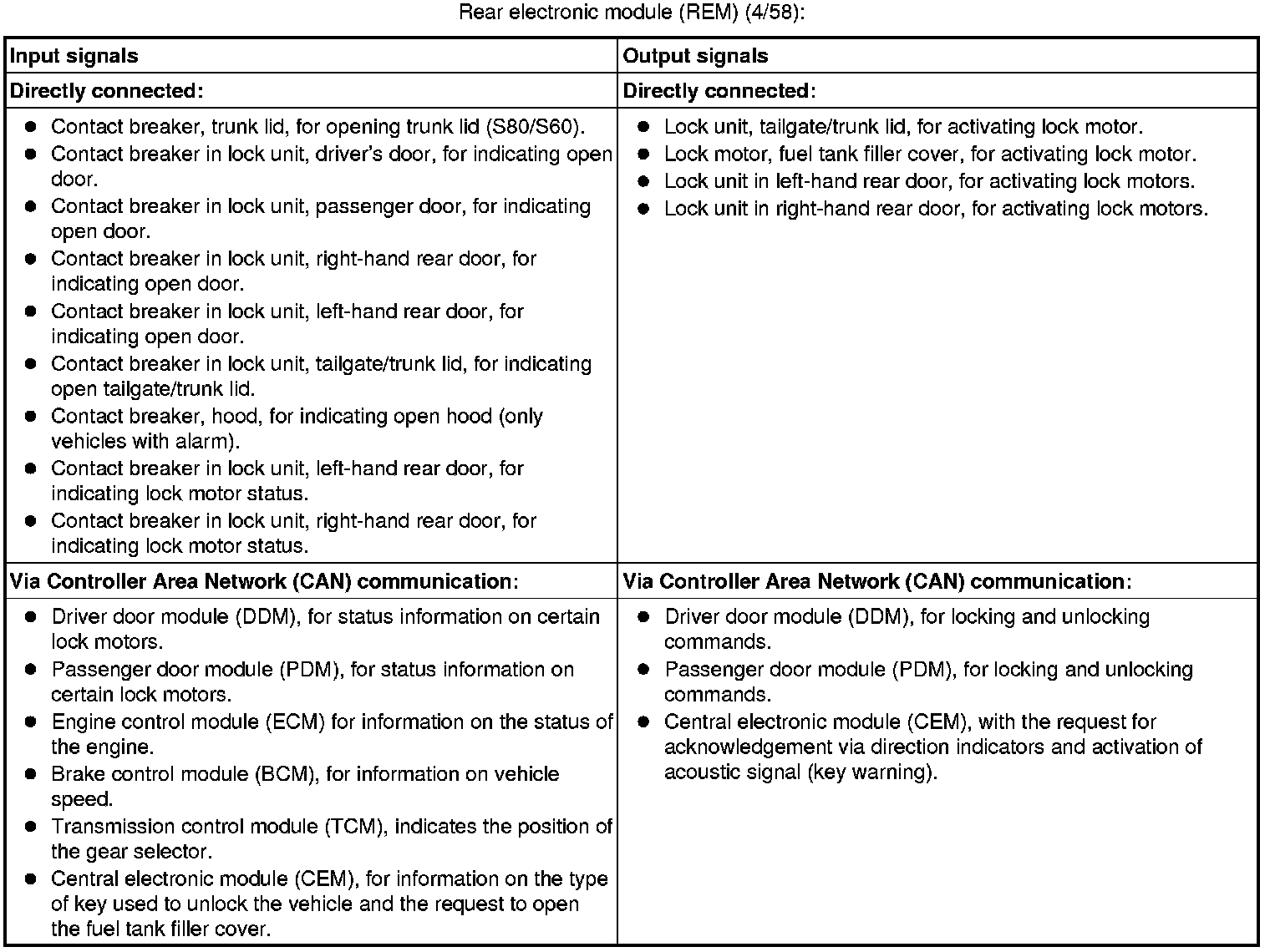 The tables below summarize the input and output signals to the units in the central locking function. The signal types are divided into directly connected signals and Controller Area Network (CAN) communication.