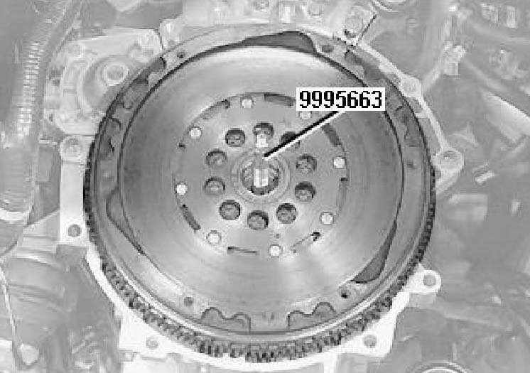 Install the centering tool in the flywheel center as far in as possible.