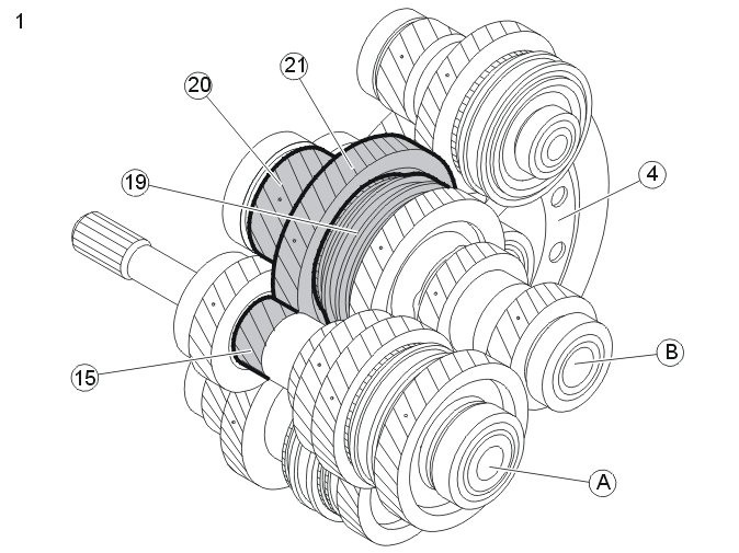 The torque is transferred across the crankshaft via the flywheel to the clutch driven plate. Half of the torque is transferred via the clutch screw to the clutch housing through lifting springs, over to the pressure plate and to the clutch driven plate. The clutch driven plate then transfers the torque via its hub and splines to the input shaft.