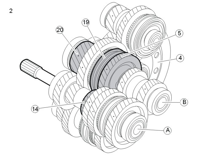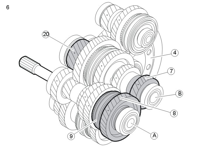 When 6th gear is selected, the coupling sleeve for 5th-6th gear is moved by a gear selector fork along the synchronizing hub towards the idler wheel for 6th gear. The coupling sleeve and synchronizing hub lock the idler wheel for 6th gear at the input shaft.