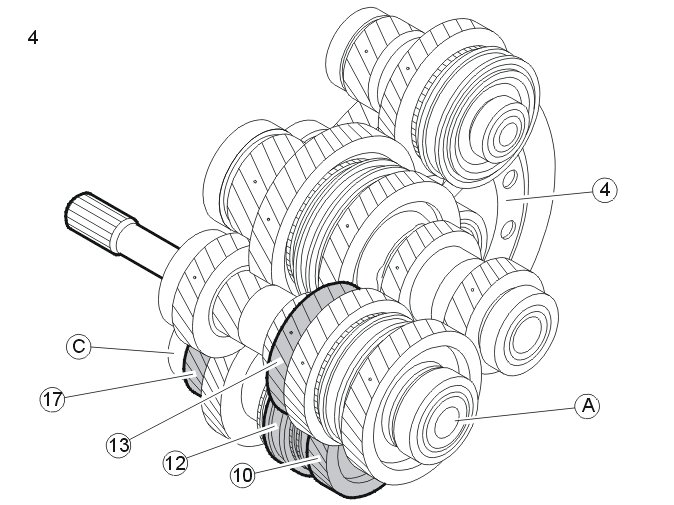 When 4th gear is selected, the coupling sleeve for 3rd-4th gear is moved by a gear selector fork along the synchronizing hub towards the idler wheel for 4th gear. The coupling sleeve and synchronizing hub lock the idler wheel for 4th gear at the intermediate shaft 3-4.