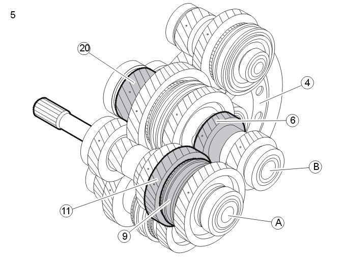 When 5th gear is selected, the coupling sleeve for 5th-6th gear is moved by a gear selector fork along the synchronizing hub towards the idler wheel for 5th gear. The coupling sleeve and synchronizing hub lock the idler wheel for 5th gear at the input shaft.