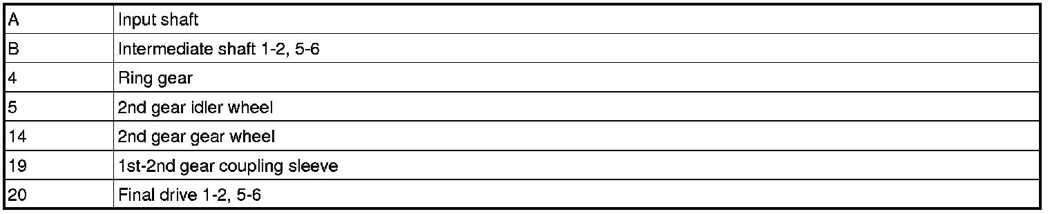 The torque of the engine is transferred via the clutch to the input shaft. The 5th-6th coupling sleeve and 5th gear idler wheel, located on the input shaft, transfer the power to the gear wheel for 5th gear. From there power is transferred on to intermediate shaft 1-2, 5-6 and to the final drive which in turn transfers the power to the ring gear. The ring gear is connected to the drive shafts through the differential.