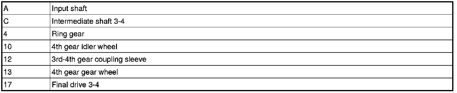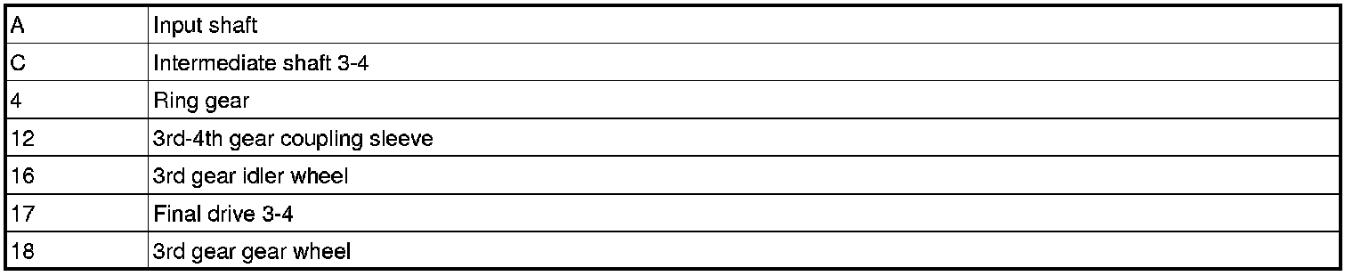 The torque of the engine is transferred via the clutch to the input shaft. The 4th gear gearwheel on the input shaft transfers the power to the idler wheel for 4th gear. From there power is transferred on to intermediate shaft 3-4 and to the final drive which in turn transfers the power to the ring gear. The ring gear is connected to the drive shafts through the differential.