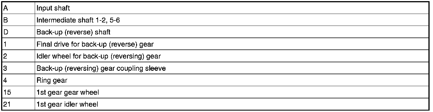 The torque of the engine is transferred via the clutch to the input shaft. The 1st gear gearwheel on the input shaft transfers the power to the idler wheel for 1st gear. From there to the back-up (reverse) gear idler wheel and then to the coupling sleeve for back-up (reverse) gear. From there power is transferred on to intermediate shaft 1-2, 5-6 and to the final drive which in turn transfers the power to the ring gear. The ring gear is connected to the drive shafts through the differential.