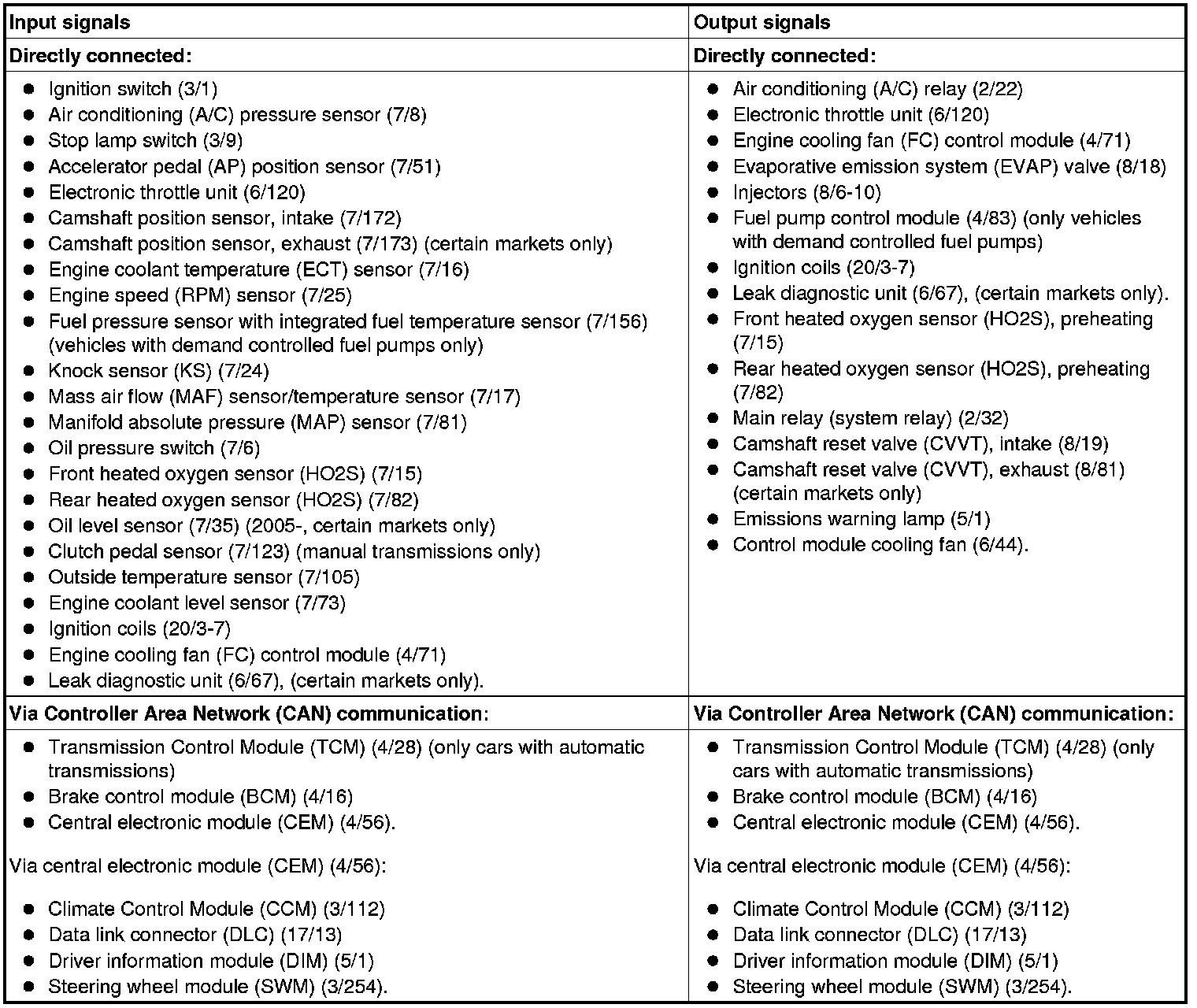 The table below summarizes the input signals to and output signals from the Engine Control Module (ECM). The signal types are divided into directly connected signals and CAN communication. The illustration below displays the same information with the Volvo component designations.