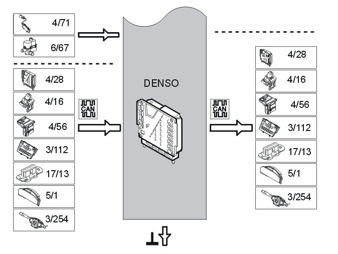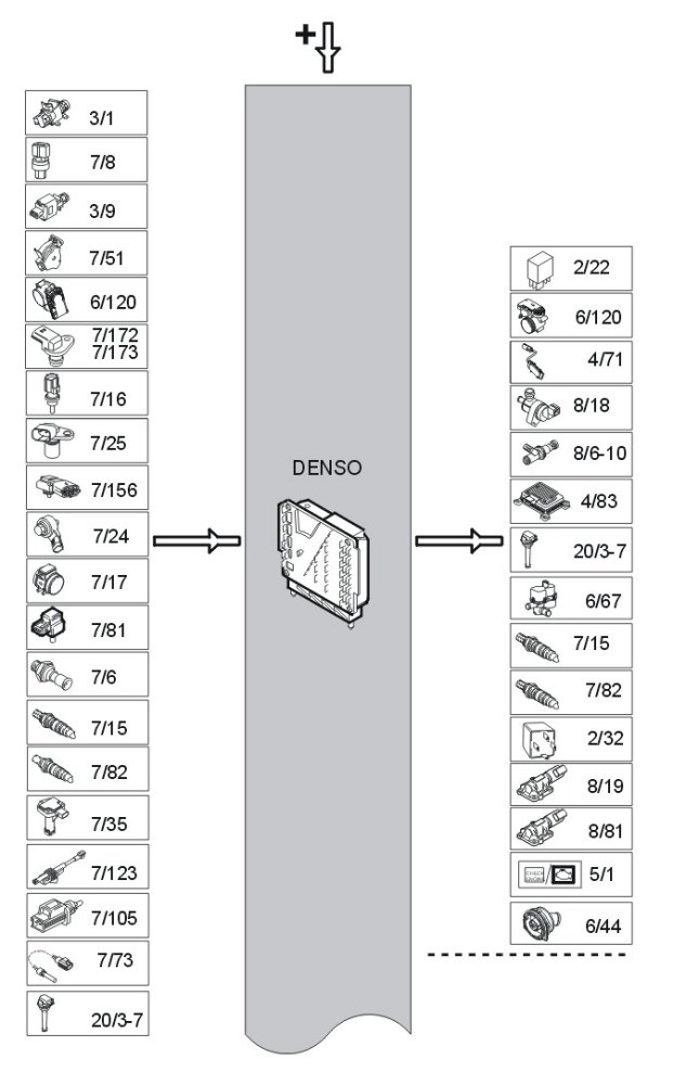 Functions which require battery power (Ubat) and high output are controlled by external or internal power stages. For example ignition coils have external power stages (integrated into the ignition coils) while the power stages for the injectors are integrated in the engine control module (ECM).