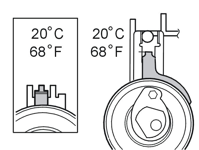 The illustration shows the position of the indicator when aligning the timing belt tensioner at approximately 20 °C/68 °F.
