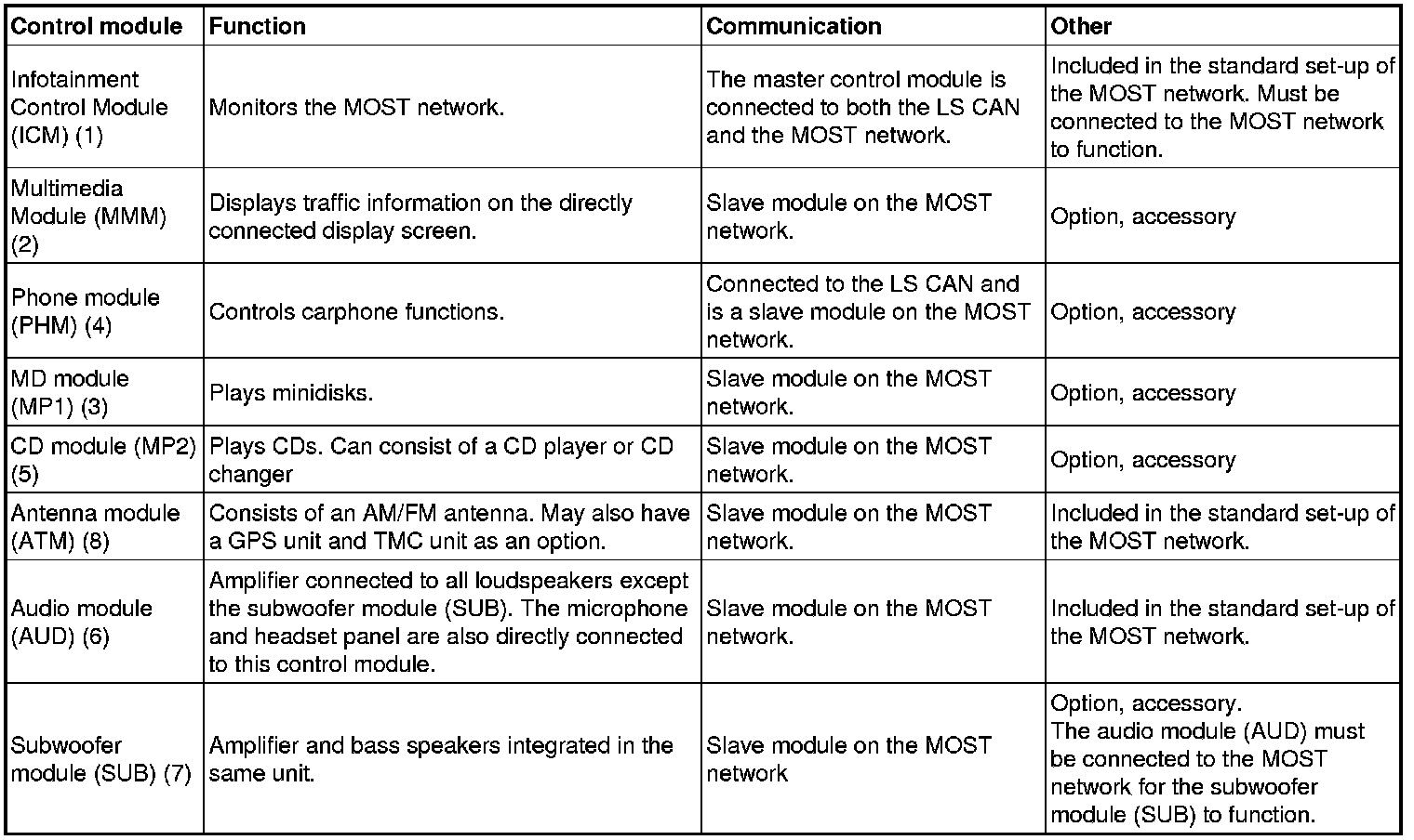 The table below lists all the control modules which may be included in the MOST network.