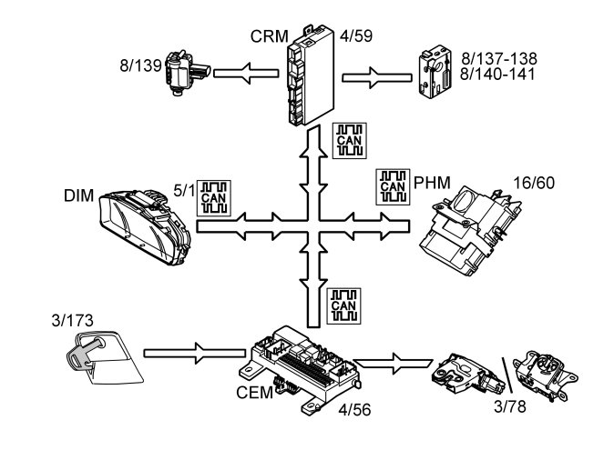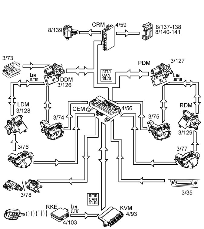 The vehicle is locked using the lock buttons on the door handles. During locking, the antenna is also activated to check that there is an authorized key in the vicinity of the vehicle. If the key is approved, the keyless vehicle module (KVM) transmits a signal to the central electronic module (CEM) to lock the vehicle.