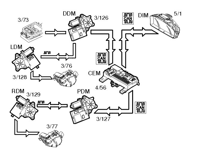 The corresponding function (Comfort Opening) is available when unlocking the vehicle. If the central electronic module (CEM) receives repeated unlock signals, corresponding to a pressed unlock button for approximately 3 seconds, it will unlock all doors as programmed into the central locking system as well as opening all windows.