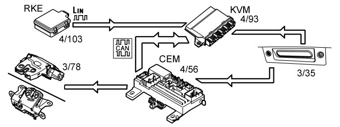If there is a keyless entry system, the keyless vehicle module (KVM) checks the identity of the key during locking and unlocking. After checking the key identity, the keyless vehicle module (KVM) then transmits a command to the central electronic module (CEM) to lock or unlock the central locking. The keyless vehicle module (KVM) uses the antennas in the outer handles on the side doors and in the rear bumper to check the identity of the key.