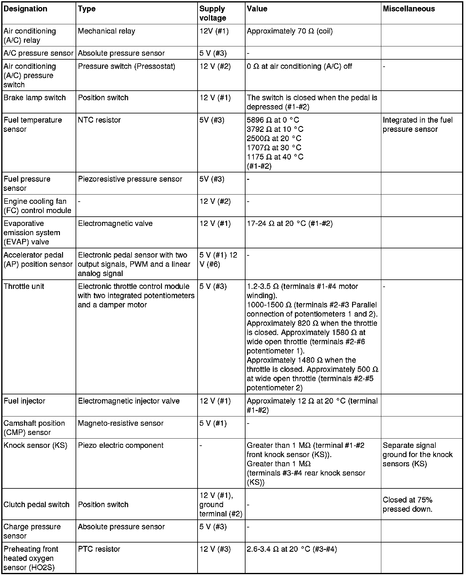The component specification gives the value of the component when the connector is disconnected. Where no value is given, it is not possible to measure a relevant value at the component.