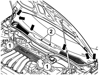 - Remove the four clips (1) in the panel over the wiper motor.