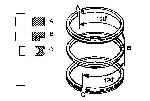 It is important that the uppermost and center rings are installed the correct way up. The lower ring can be installed any way up. Distribute the piston ring openings as follows.