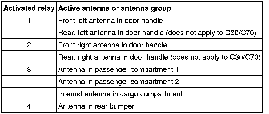 The keyless vehicle module (KVM) contains 4 relays. The control module uses these relays to select the antennas to be activated. See the table below.