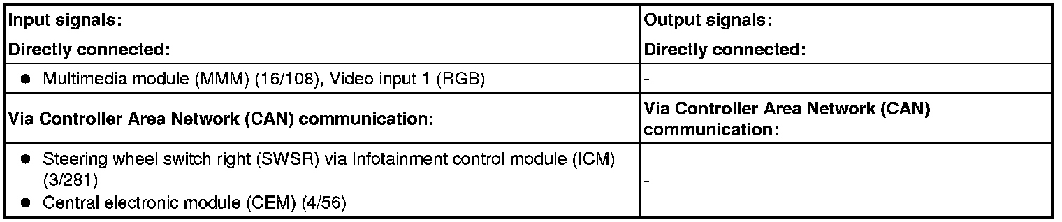 The table below summarizes the input signals to and output signals from the High Level Display Front (HLDF). The signal types are divided into directly connected signals and CAN communication. The illustration below displays the same information with the Volvo component designations.