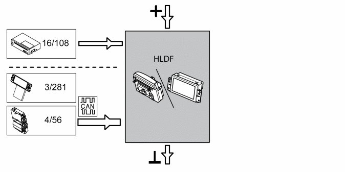 High Level Display Front (HLDF) communicates both with the directly connected components, and with other control modules via CAN communication.