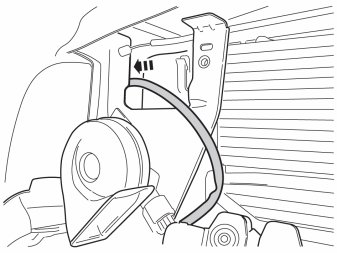 - Take the siren and insert the right stud bolt in the holder's right hole and hook on the left stud bolt in the attachment bracket in front of the air inlet for the climate unit.