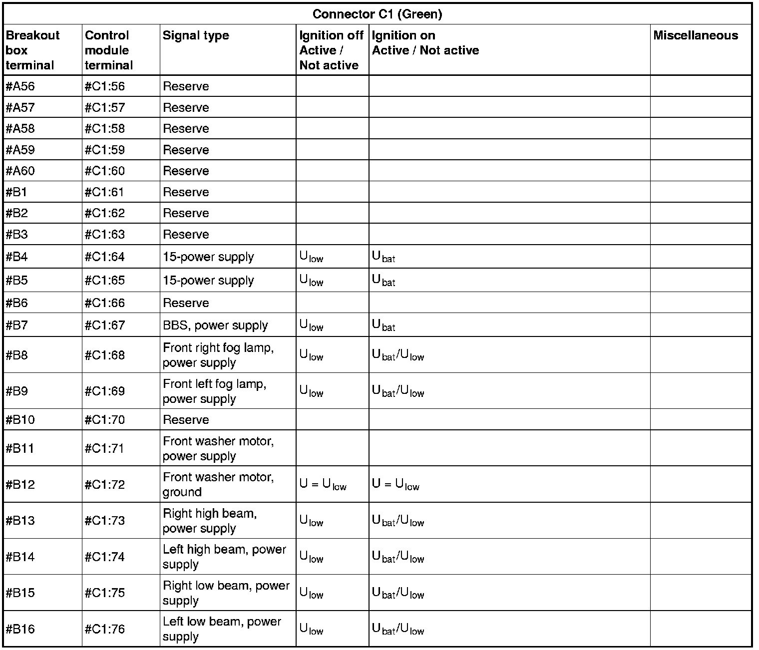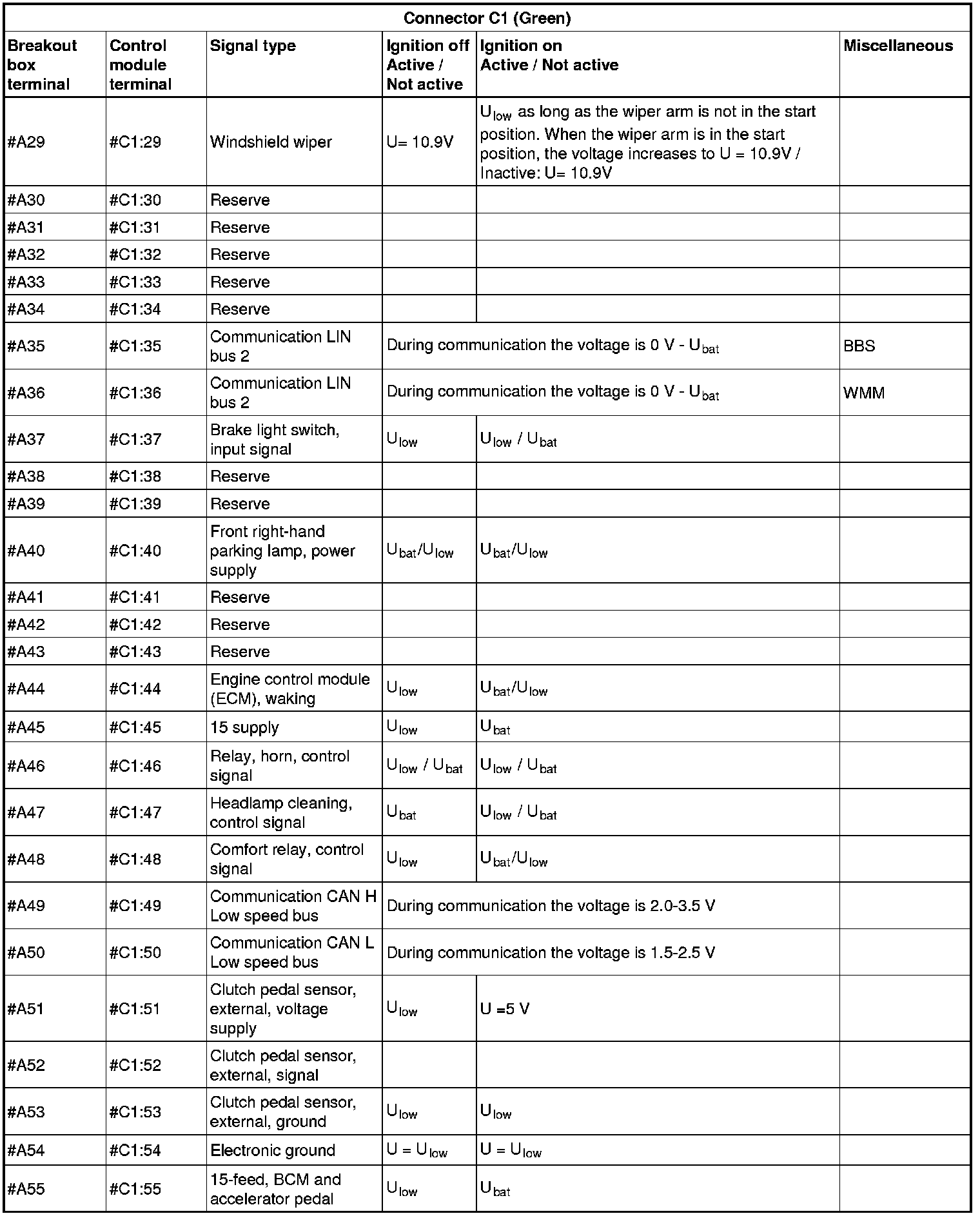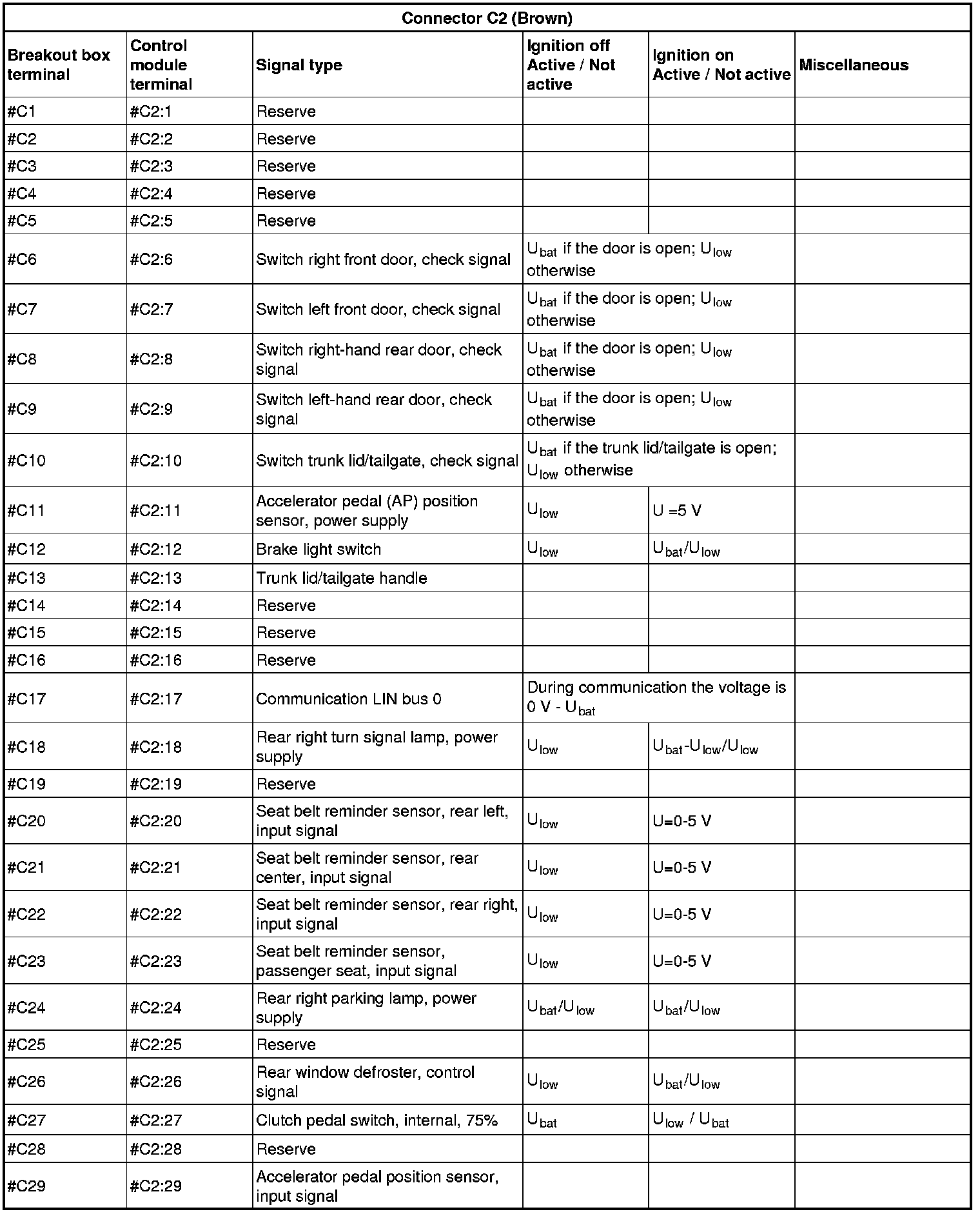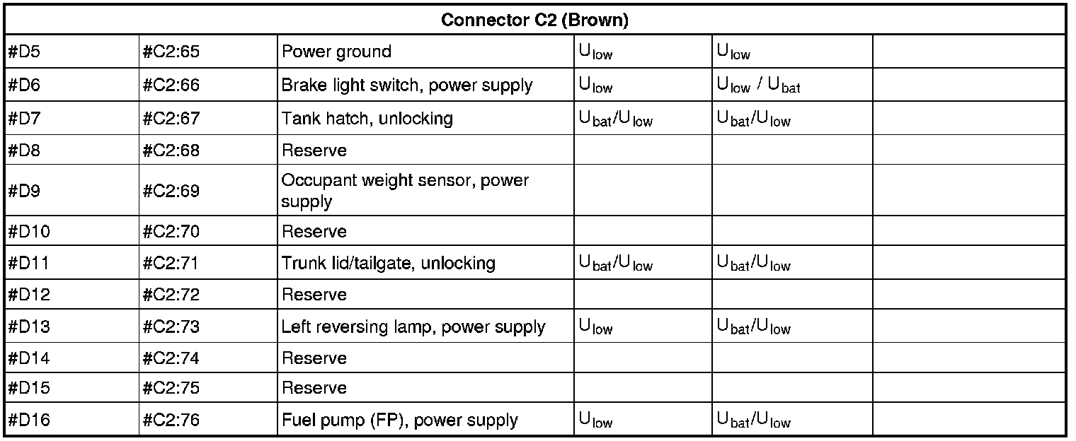 All values given below are between the terminals stated in column 1 and terminal #D5 (power ground). This applies unless otherwise indicated in the last column.