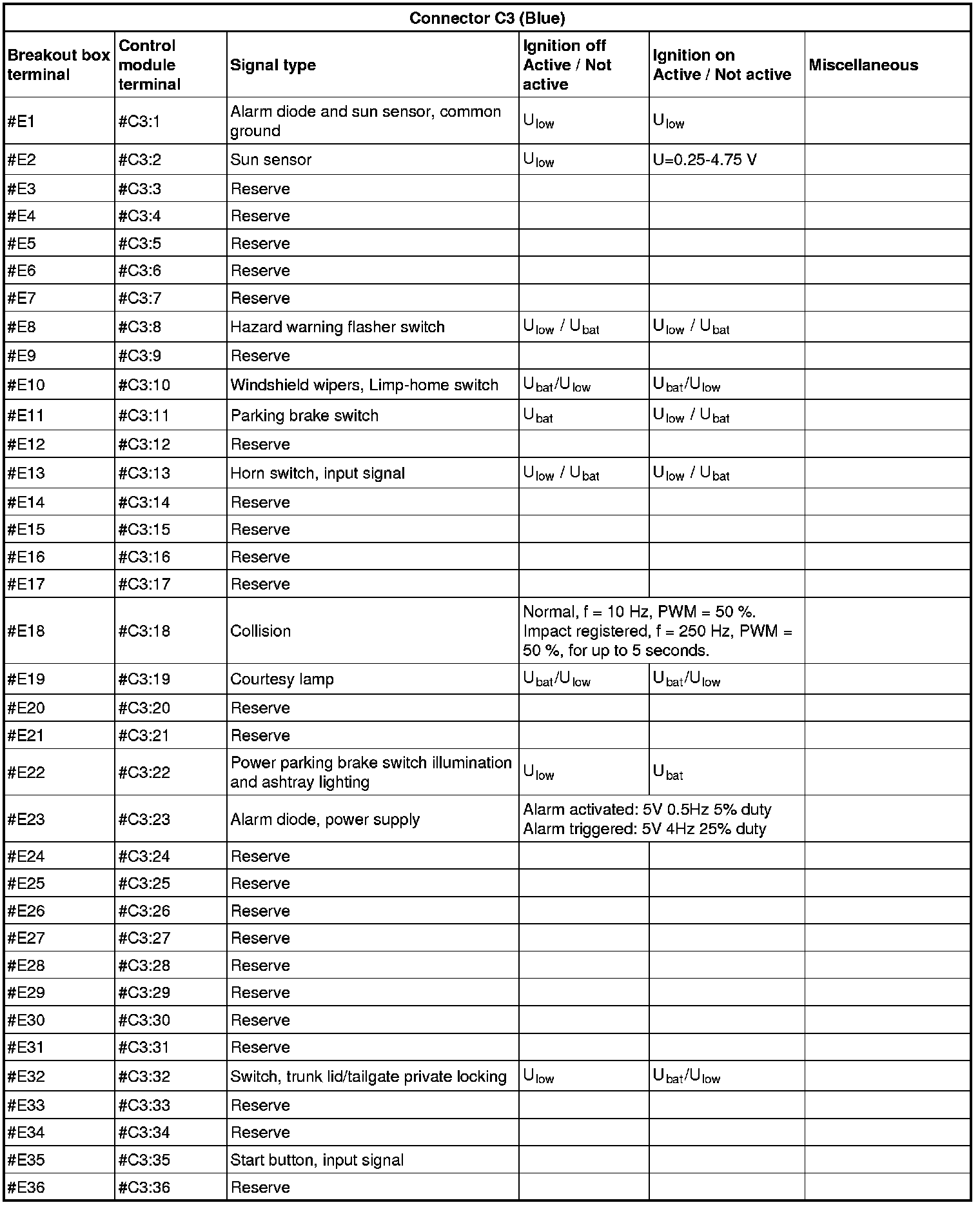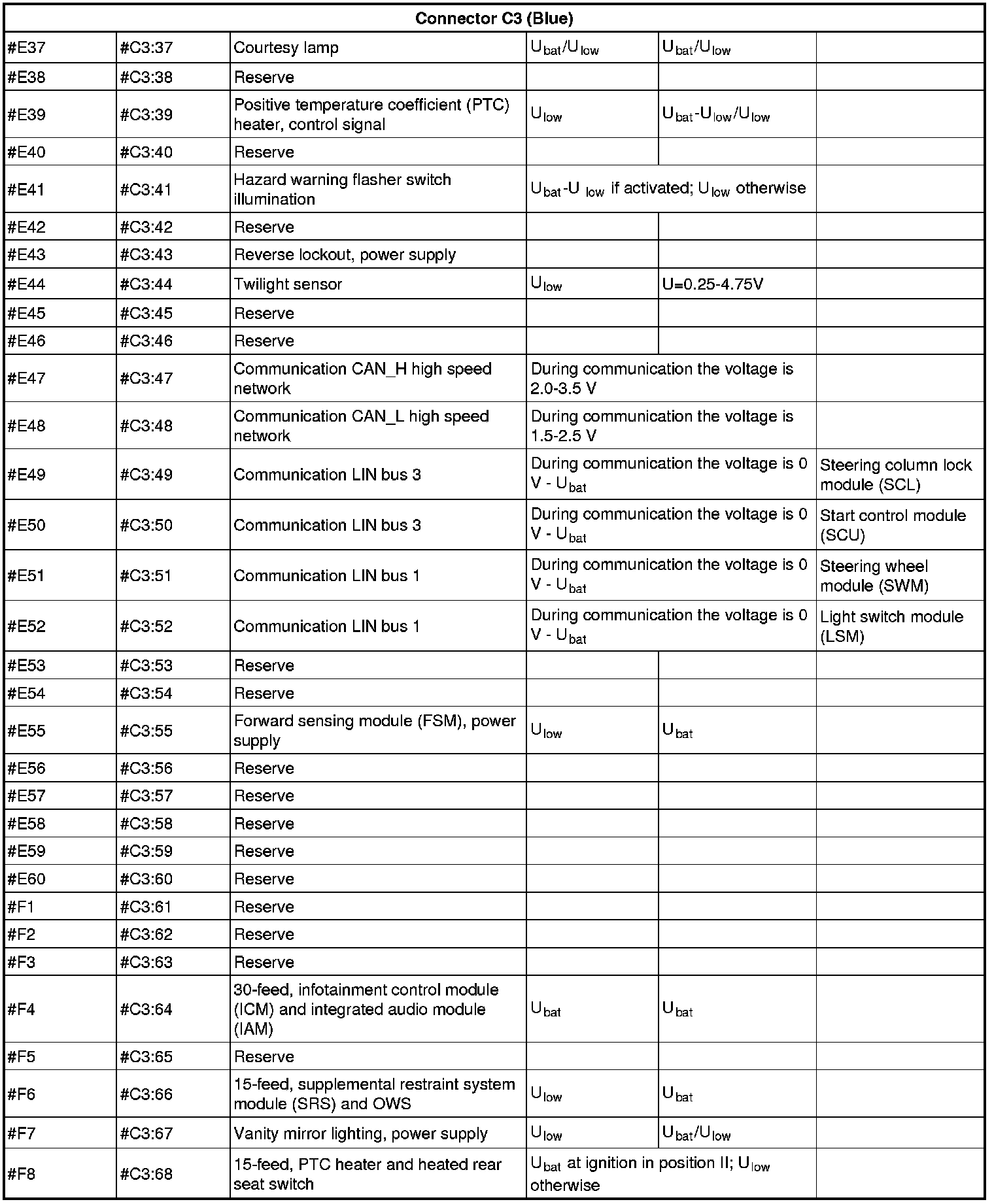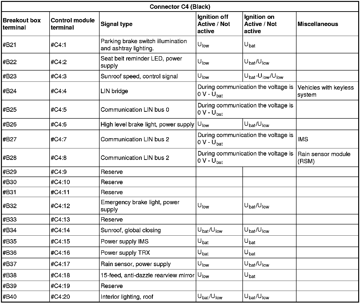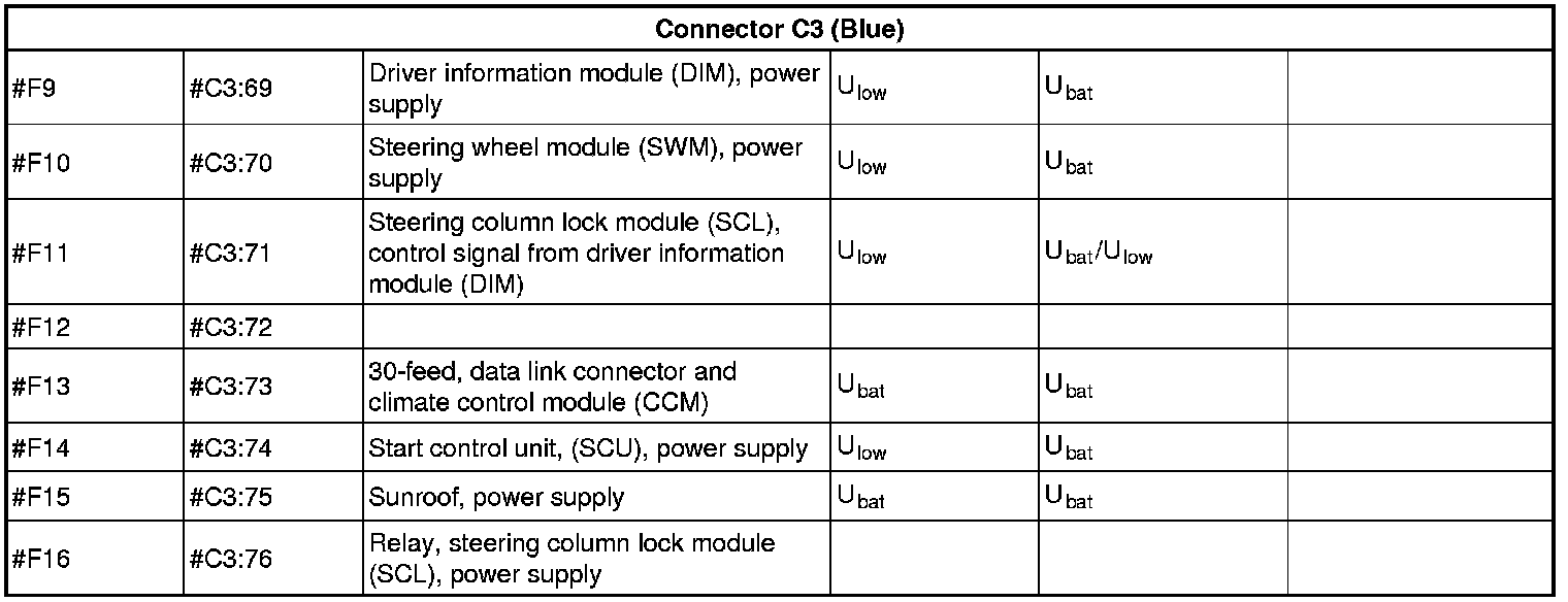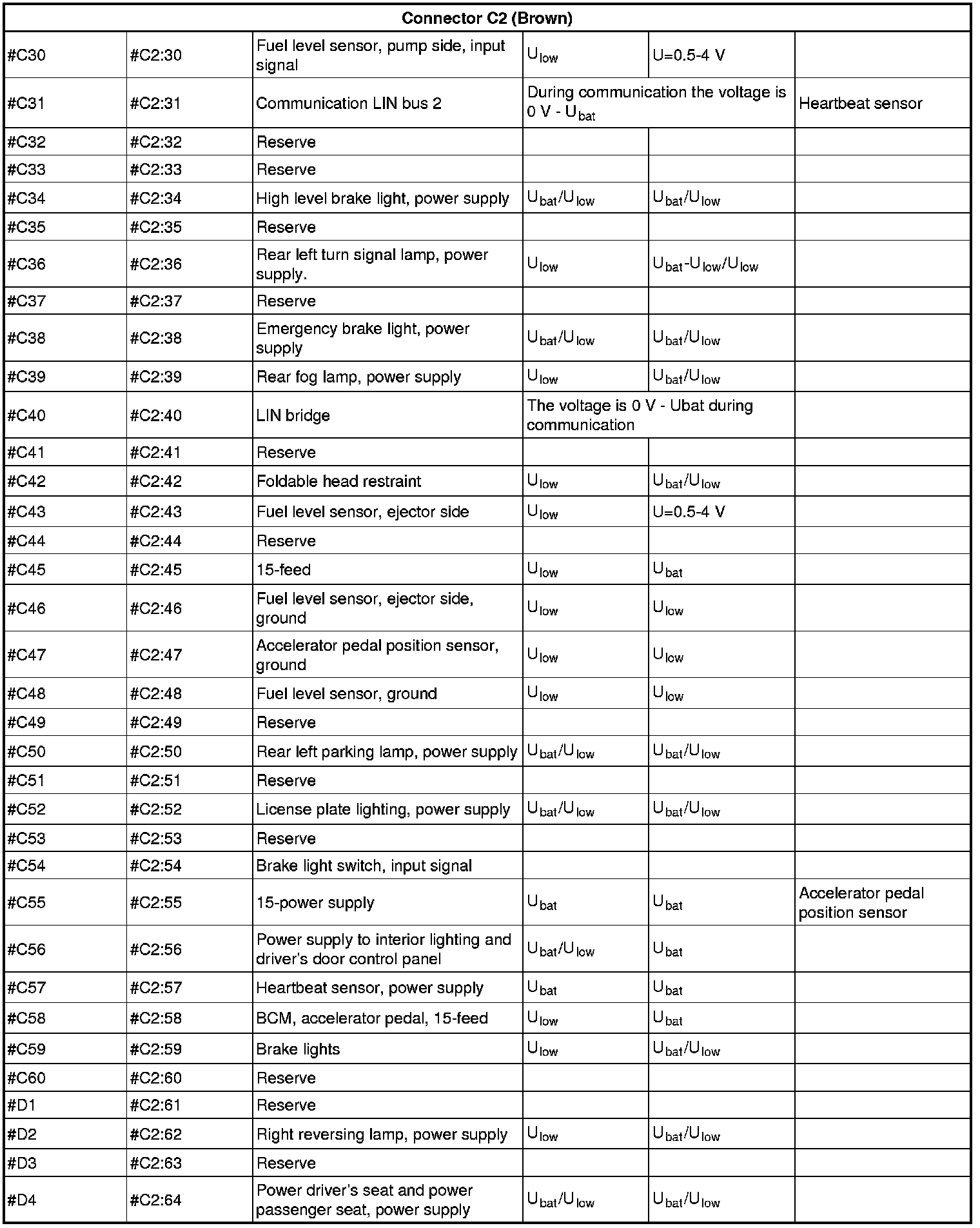All values given below are between the terminals stated in column 1 and terminal #D5 (power ground). This applies unless otherwise indicated in the last column.
