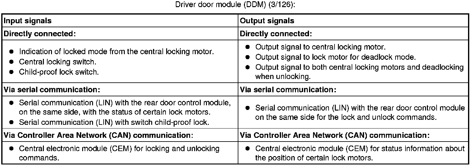 The tables below summarize the input and output signals to the units in the central locking system. The signal types are divided into directly connected signals, serial communication and controller area network (CAN) communication.