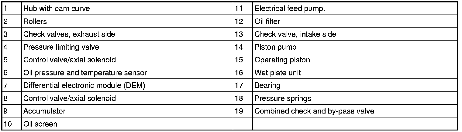 The basic pressure is generated by the electronic feed pump. This pressurizes the annular pistons with oil so that they are pressed against the hub's cam curve via rollers. The annular pistons generate a working pressure which is led to the operating piston via the check valves on the intake side. This pressure creates a fixed connection between the input and output shafts. The maximum pressure is limited by the pressure limiting valve. Large differences in speed on the input and output shafts enable the annular pistons to create an oil flow. The oil flow is less if the input and output shafts are at the same speed. The oil flow, created by the annular pistons, is controlled by the control valve, which in turn is controlled by the axial solenoid. A closed control valve produces high pressure, which causes maximum pressure on the clutch driven plates. This produces a maximum power transmission. An open control valve produces low pressure, which causes minimum pressure on the clutch driven plates. This produces a limited power transmission.