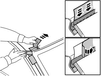 The masking consists of two plastic foil pieces that are to be inserted between the window seal strip and the roof side, and are then to be taped against the rear window.
