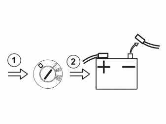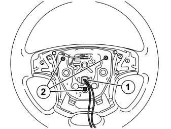 - Detach the ground cable (1) and connector (2) and remove the signal ring from the steering wheel. Put it aside.